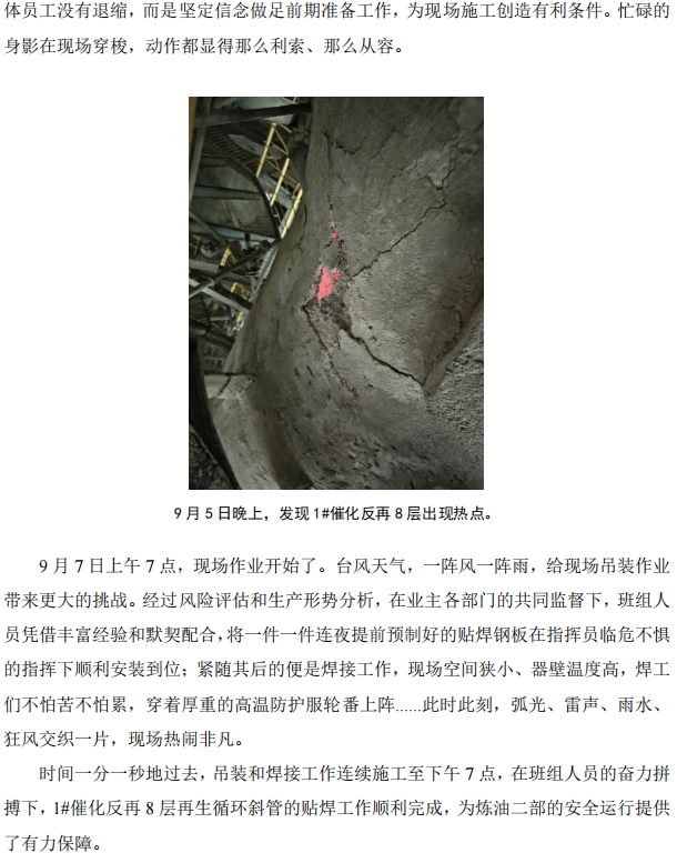 臺風(fēng)前夕!北海公司對 1#催化再生循環(huán)斜管貼焊搶險